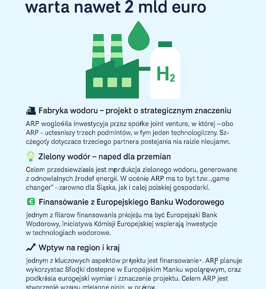 Redakcja Wodorowe.info2025-06-18Agencja Rozwoju Przemysłu (ARP) ogłosiła plany budowy fabryki zielonego wodoru na Śląsku. Inwestycja o wartości od 1,5 do 2 miliardów euro może stać się przełomem dla polskiej gospodarki,...